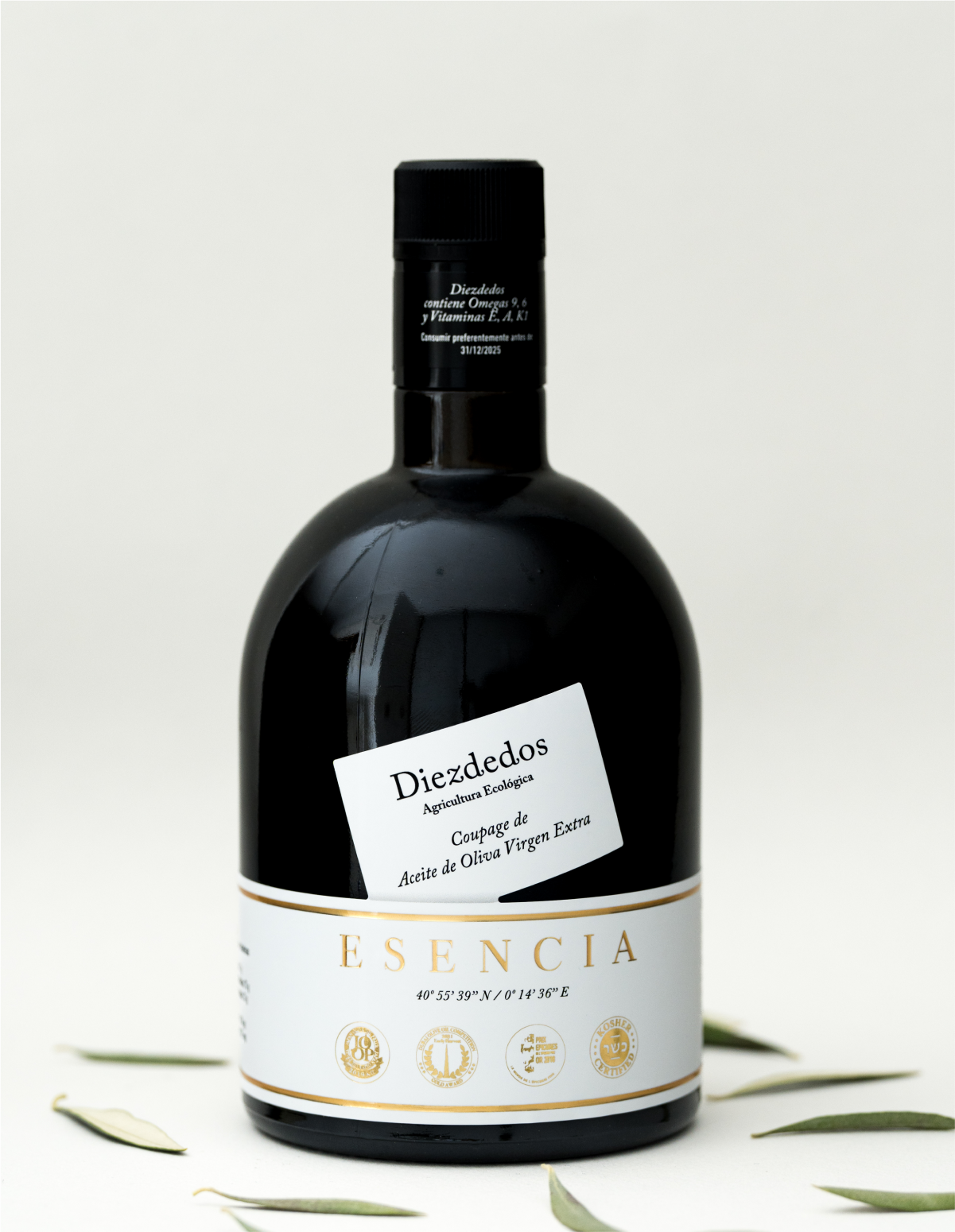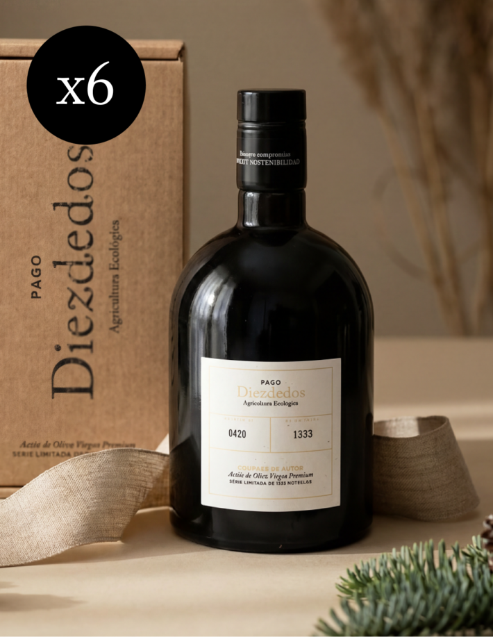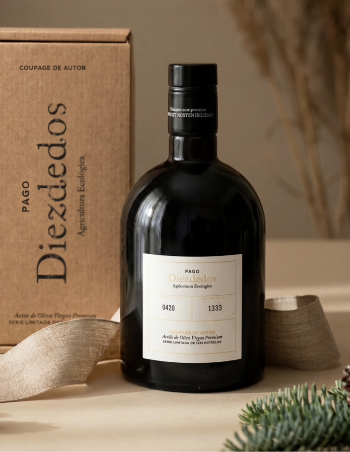 ESENCIA Diezdedos nace de la ilusión de poner en boca el alma del “Terroir” de la finca Diezdedos, realizando un COUPAGE real en proporción de las 5 variedades de olivos plantados en nuestra finca de 60 Has, llevamos el “terroir” a tu mesa.